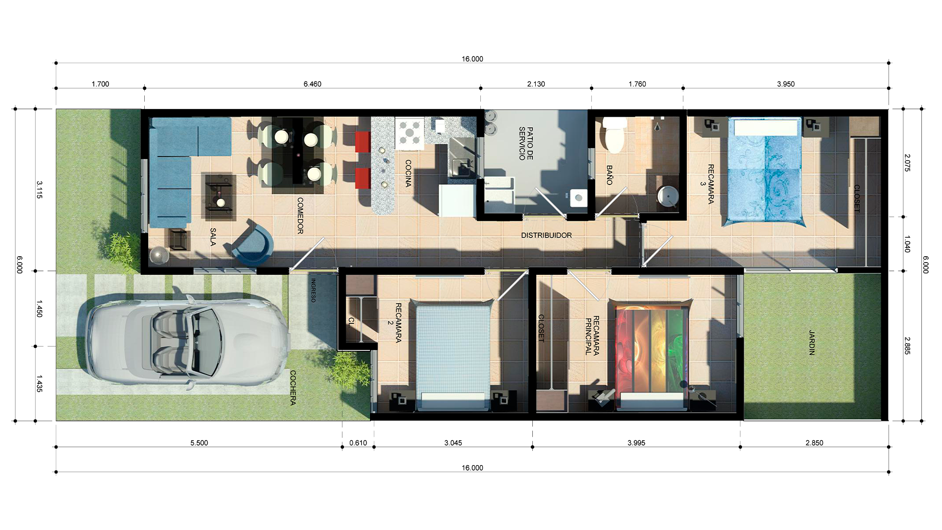 CaracterísticasSala, comedor, cocina, 3 recámaras, 1 baño, patio de servicio, patio posterior, cochera para 1 auto.